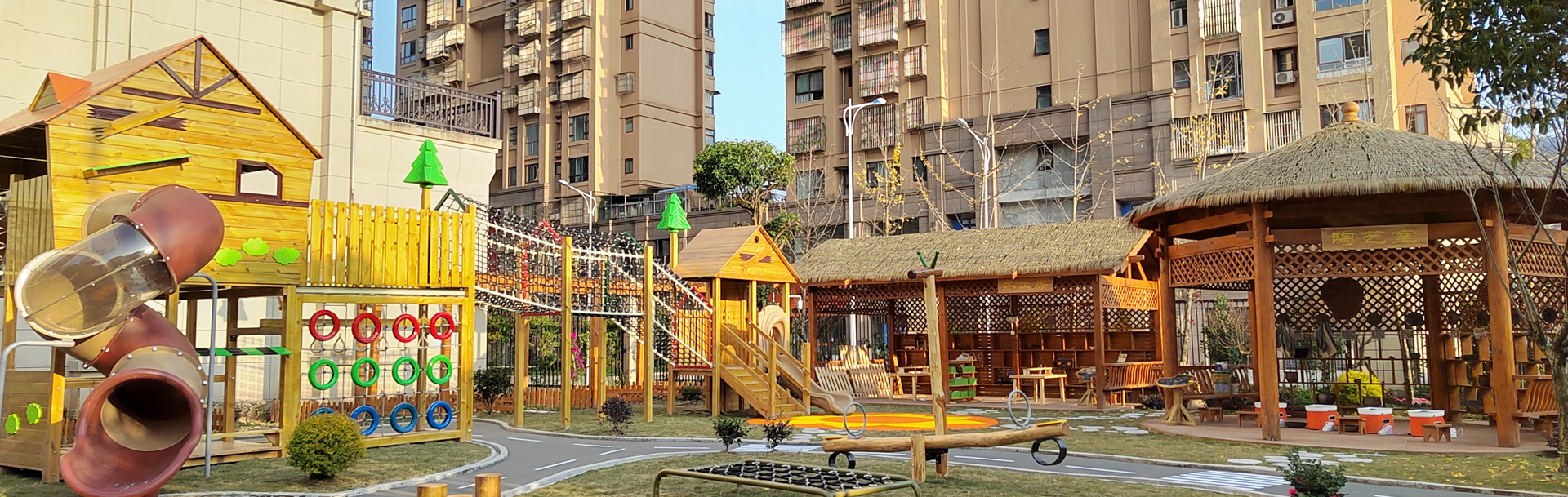 設施風格將童趣、自然、生態(tài)、生活相融合,設施主體采用自然刺槐木、色彩跳躍,創(chuàng)造一個自然主題的童話世界。