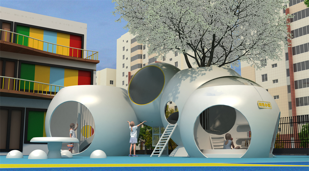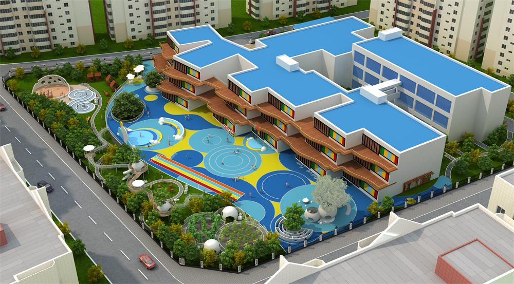 這個幼兒園主要的設(shè)計主題是“泡泡森林”,以白色、藍色與黃色色系為主。為何泡泡是白色而不是彩色?因為每個孩子都如同白紙一般純潔,這張純潔的白紙是需要我們共同來渲染的,最后成就他們的彩色的人生。藍色代表天空,就猶如泡泡們飛舞在天空一般,孩子們的夢想也一同伴隨著泡泡飛翔在自由的天空。而黃色代表著光明,迎領(lǐng)著孩子們飛向正確方向,正如老師般的引導(dǎo)。